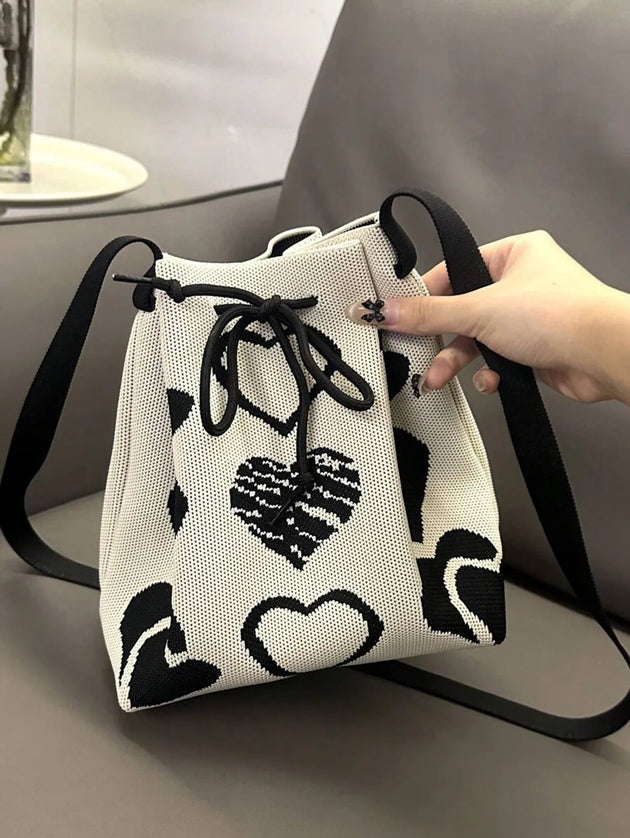 Korean Style Cute Geometric Pattern Knitted Drawstring Bucket Crossbody Bag -